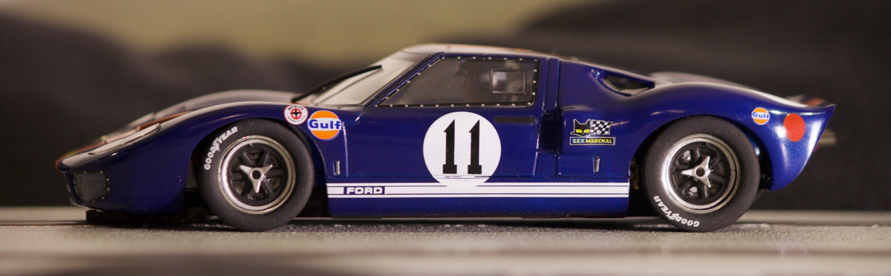 I'm struggling with the performance of my Gulf Ford right now, and it's a considerably different car from the Shell Ford, even though they're essentially the same in construction and design. Problem is, I have tweaked the Shell car pretty seriously to get it to run faster, and I've done comparatively no tweaking to the Gulf car all this time. It was fine out of the box, so I didn't touch much except doing the most basic pre-race tuning procedures. But that's the great thing about slot cars. You never know what you can get out of a car until you try, and the differences in the two Fords proves that. It'll be a challenge to get the Gulf Ford up to speed, but it'll be totally fun. Looking forward to it.